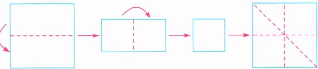 9. 如图,把一张正方形纸片先上下对折,再左右对折,然后展开斜着对折一次,最后展开。