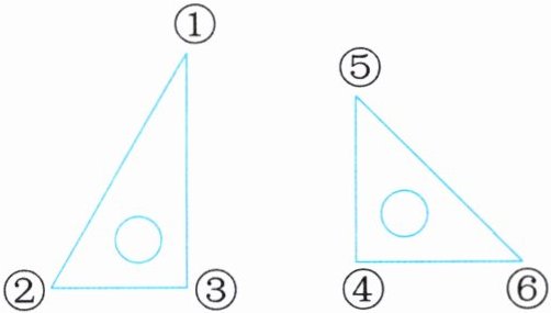 (1)2个 ①⑤、①⑥(2)6个 ①④、②④、②⑤、②⑥、③⑤、③⑥解析:分别用左边三角尺的①号角与右边三角尺的三个角拼一拼,再用②号角与右边三角尺的三个角拼一拼,最后用③号角与右边三角尺的三个角拼一拼,逐一判断哪些是钝角。