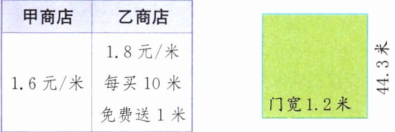 解析:由题图可知,篱笆的长为44.3×4-1.2=176(米)。因为乙商店每买10米免费送1米,1+10=11(米),176÷11=16(个),所以在乙商店实际只要买16×10=160(米)就能得到176米篱笆,由此通过计算比较在两家商店买篱笆的价钱即可。