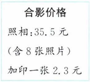42-8=34(张) 2.3×34=78.2(元) 35.5+78.2=113.7(元) 解析:先根据加印照片的张数=总张数-合影照包含的张数,求出需要加印的照片张数,再根据总价=单价×数量,求出加印照片的钱数,最后根据总钱数=照相的钱数+加印照片的钱数,求出一共需要付的钱数。