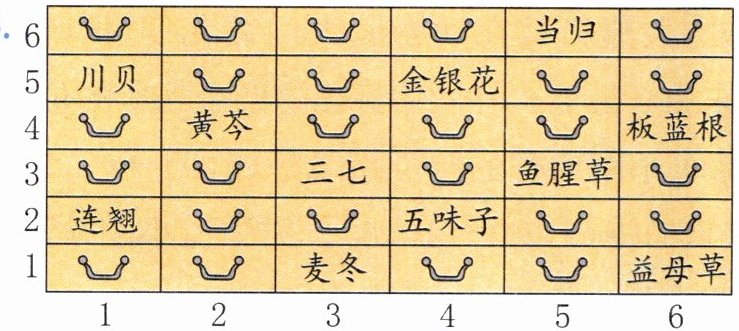 (1)医生开了一个药方:鱼腥草、黄芩、板蓝根、金银花、连翘。鱼腥草在药柜上(5,3)的位置,请用数对表示出下面药材在药柜上的位置。