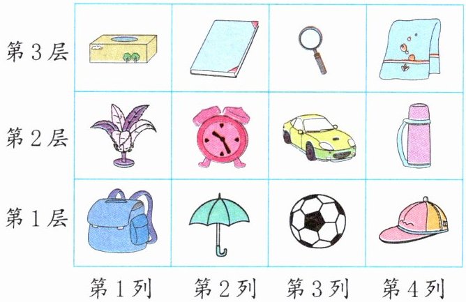 (1)第4列、第2层是水杯,如果它的位置可以用数对(4,2)表示,那么毽子的位置可以用数对( , )表示,放大镜的位置可以用数对( , )表示。