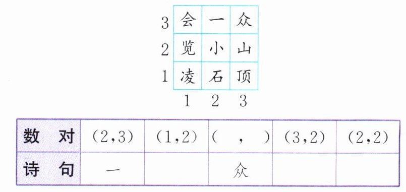 2.(学科融合)在《中国诗歌大会》上,常常用“九宫格”来考查选手的诗词识别能力,请你根据数对提示的信息,补全表格。
