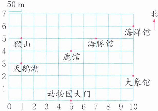 (3)50×7=350(m) 解析:由题意可知,从鹿馆出发去海洋馆,至少要走7格,每个小方格的边长为50m,50×7=350(m),所以芳芳至少要走350m。