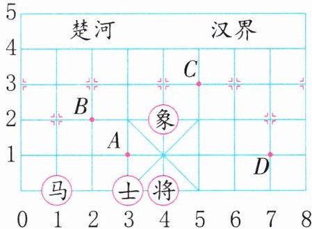 7.(传统文化)象棋历史悠久,是我国传统棋种。其中“马走日,象飞田”的口诀为世人所熟知。下面是象棋棋盘的一部分,图中🐴可以直接走到点A、B等处。若🐴的位置在点C处,为了到达点D处,请按🐴走的规则,在下面的棋盘上用虚线画出一条你认为合理的行走路线,并用数对表示出该行走路线.