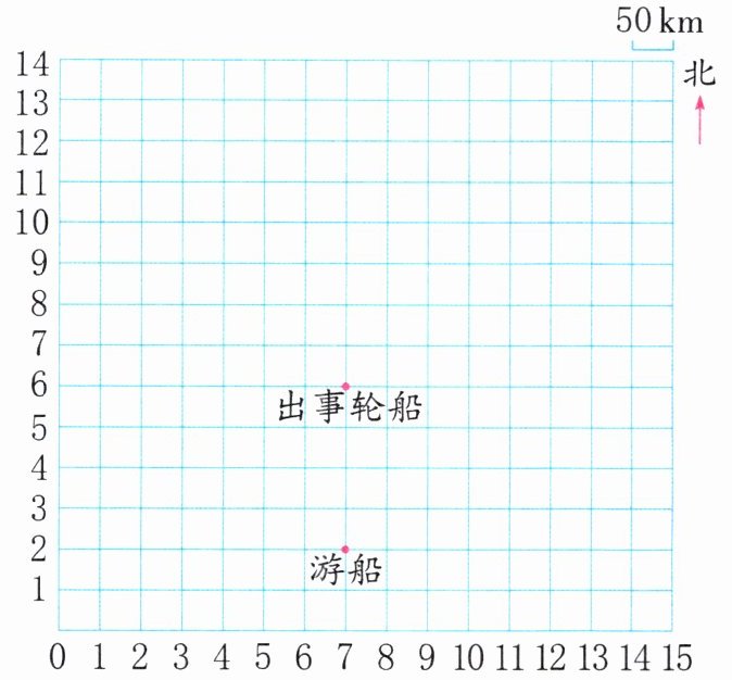 (2)军舰位于(13,11)的位置;货船在出事轮船以西200 km,再往北150 km处。在图中标出它们的位置。