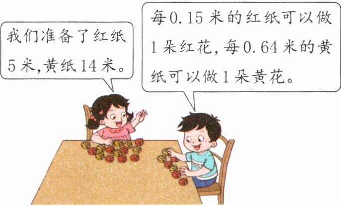 5÷0.15≈33(朵) 14÷0.64≈21(朵) 33÷3=11(束) 21÷3=7(束) 7<11 一共可以扎成7束 解析:先求出准备的红纸和黄纸分别能做多少朵红花和黄花,再根据3朵红花和3朵黄花扎成1束,求出红花和黄花分别最多可以扎成多少束,最后进行比较,可以扎成的数量少的即为一共可以扎成的数量。