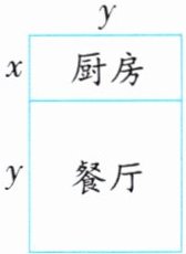 (1)2(x+y) xy 解析:由题图可知,厨房是一个长和宽分别为y和x的长方形。 (2)4y $ y^2 $ 解析:由题图可知,餐厅是一个边长为y的正方形。 (3)2(x+y+y) (x+y)y 解析:整个平面图是一个长方形,且长是x+y,宽是y。