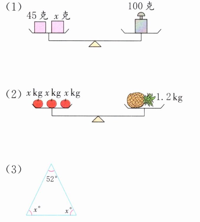 (1)45+x=100 (2)3x=1.2(3)2x+52=180