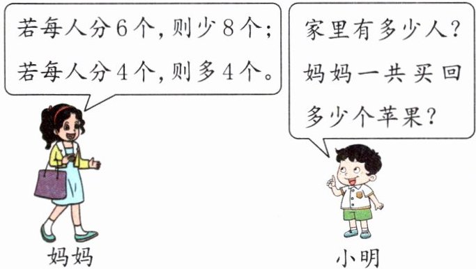 6×6-8=28(个) 解析:根据题意,妈妈买回的苹果总个数是一定的,用“每人分的个数6×家里的人数-8”能求出苹果的总个数;用“每人分的个数4×家里的人数+4”也能求出苹果的总个数,因为两种求苹果总个数的方法都需要知道家里的人数,所以可以设家里有x人,由此列方程解答。