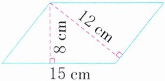 15×8=120(cm²) 120÷12=10(cm) (15+10)×2=50(cm) 解析:先求出平行四边形的面积,再根据面积和高,求出12 cm的高对应的底的长度。铁丝的长就是平行四边形的周长,用一组邻边的和×2即可求解