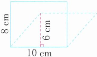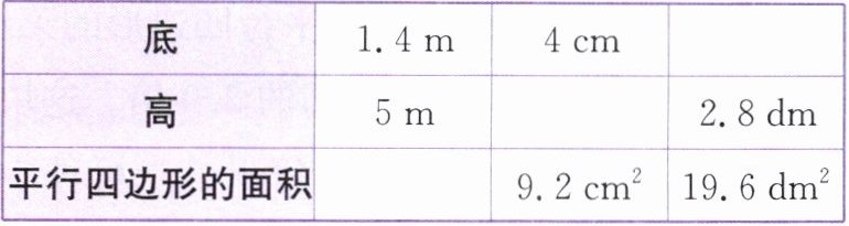 底 1.4 m 4 cm 7 dm 高 5 m 2.3 cm 2.8 dm 平行四边形的面积 7 m² 9.2 cm² 19.6 dm²