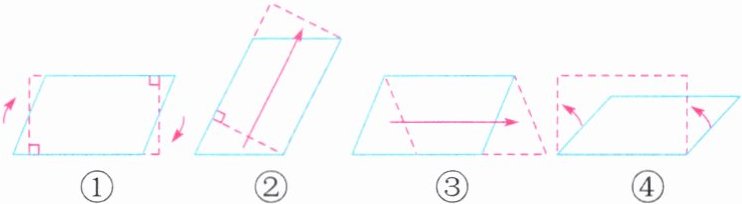 C 解析:本题考查平行四边形面积计算公式的推导方法。图①和图②都是使用割补法,把割下的部分补到虚线的位置,前后面积不变,可将平行四边形转化为长方形。因此能推导出平行四边形的面积计算公式图③割补后,还是一个平行四边形,不能推导出平行四边形的面积计算公式。图④将一个平行四边形拉成一个长方形,通过观察可以明显看出图形面积变大了,且无法确定变大了多少,因此不能推导出平行四边形的面积计算公式