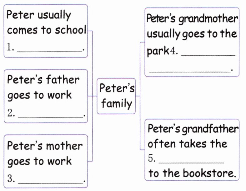 五、[新考法] Peter 向同学们讲述了家人的出行方式。请听他的介绍,完成思维导图。