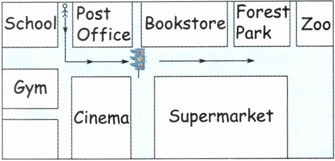1. next to 2. go straight 3. turn left 4. slow down and stop 5. go straight