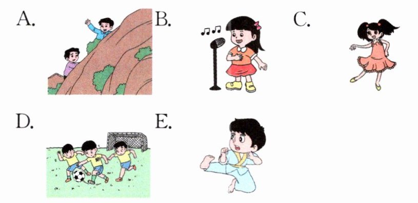 1. doing kung fu 2. listening to music 3. singing; dancing 4. playing football 5. reading books