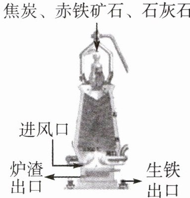 8. 生产情境 工业生产 铁是生产生活中应用最广泛的金属,通过冶炼铁矿可以制得铁。如图是工业上高炉炼铁的装置图,回答下列问题。
