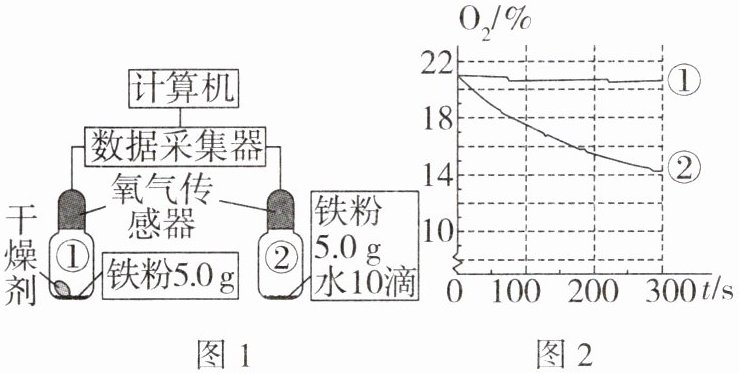 (4)分析图2可知,相同时间内曲线②对应实验的耗氧量大于曲线①,说明广口瓶②中铁粉发生锈蚀,从而得出铁锈蚀需要 。