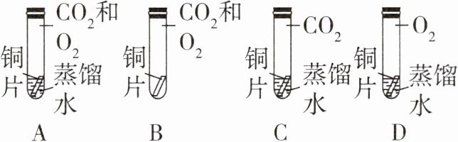 (1)A试管中铜片与蒸馏水、二氧化碳和氧气接触,铜片锈蚀,B试管中铜片与二氧化碳和氧气接触,铜片无明显现象,C试管中铜片与蒸馏水和二氧化碳接触,铜片无明显现象,D试管中铜片与氧气和蒸馏水接触,铜片无明显现象,对比A、B试管中的现象可知,铜锈蚀需要与水接触,对比A、C试管中的现象可知,铜锈蚀需要与氧气接触,对比A、D试管中的现象可知,铜锈蚀需要与二氧化碳接触,通过上述实验可知铜锈蚀是铜与水、二氧化碳和氧气共同作用的结果。