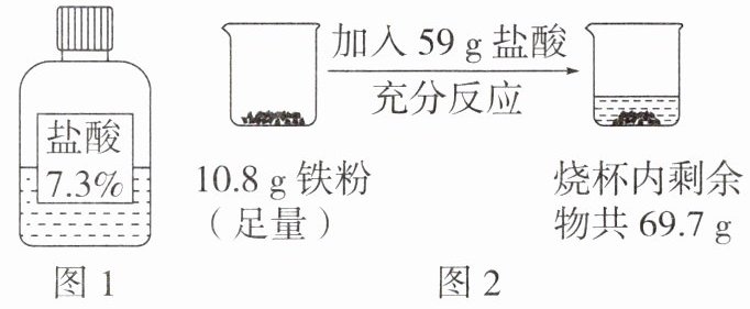 2. (教材习题改编)为确定实验室某瓶盐酸(如图1)中溶质的质量分数是否与标签标示相符,小明同学利用此盐酸与足量铁粉反应(杂质不参与反应,忽略${HCl}$的挥发性)进行实验探究,实验过程及数据如图2所示。通过计算,确定该盐酸中溶质的质量分数是否与标签标示相符。