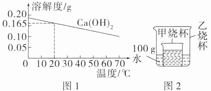2. 氢氧化钙的溶解度曲线如图1所示。同学们在20℃时进行了如图2所示的实验:甲烧杯中是氢氧化钙的饱和溶液,向乙烧杯中加入0.2g生石灰后,下列有关说法正确的是(
