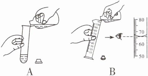 保持水平。(3)如图 A、B 所示,在倾倒液体的过程中,瓶塞均要倒放在实验台上的原因是