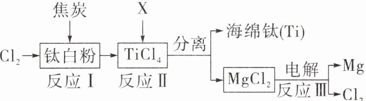 该题对物质X的分析易出错。原因是没有灵活应用化学反应前后元素种类不变分析问题、解决问题。充分解读图示信息,反应Ⅱ中$\mathrm{T}\mathrm{i}\mathrm{C}{\mathrm{l}}_{4}$和X反应生成$\mathrm{M}\mathrm{g}\mathrm{C}{\mathrm{l}}_{2}$和$\mathrm{T}\mathrm{i}$,从反应前后元素种类不变角度分析,确定X中一定含有镁元素,在此基础上进一步分析可顺利解题。