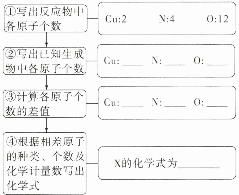 例 1 传统文化情境 科技成就 火药是我国古代四大发明之一,向火药中加入硝酸铜,其爆炸时会产生绿色火焰,发生的反应为$2\mathrm{C}\mathrm{u}(\mathrm{N}{\mathrm{O}}_{3}{)}_{2}\xlongequal{\triangle }2\mathrm{C}\mathrm{u}\mathrm{O}+{\mathrm{O}}_{2}\uparrow +4\mathrm{X}\uparrow$,其中 X 的化学式为 (