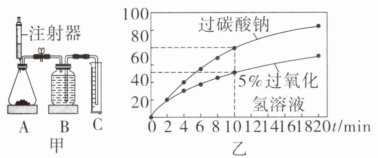 为了进一步选择合适的制氧剂,同学们在总产氧量相同(150 mL)的情况下,用图甲装置对5%过氧化氢溶液和过碳酸钠的制氧效率进行比较,并记录0~20 min内量筒中水的体积(氧气溶于水的误差忽略不计),绘制曲线如图乙。