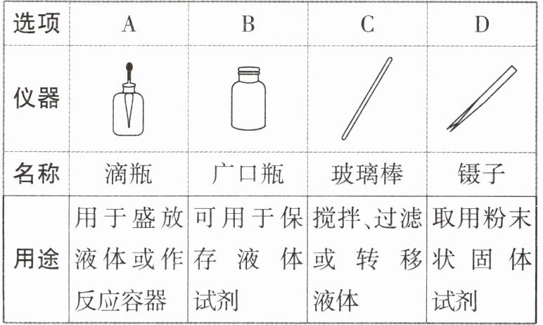 | A | | 滴瓶 | 用于盛放液体或作反应容器 |