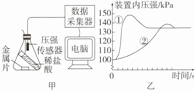 2. 分别取足量的表面积相同且打磨光亮的镁片、铁片与等体积、等浓度的稀盐酸反应,用数字化传感器测得压强随时间变化曲线如图所示。