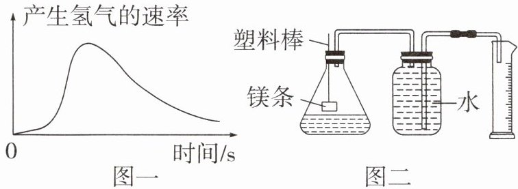 3. 镁与稀盐酸、稀硫酸均能发生反应。如图一是未经打磨过的镁条与少量稀盐酸反应时产生氢气的速率随时间的变化关系图。