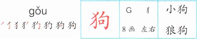 笔画顺序:丿、丿、㇈、丶,共8画左右。