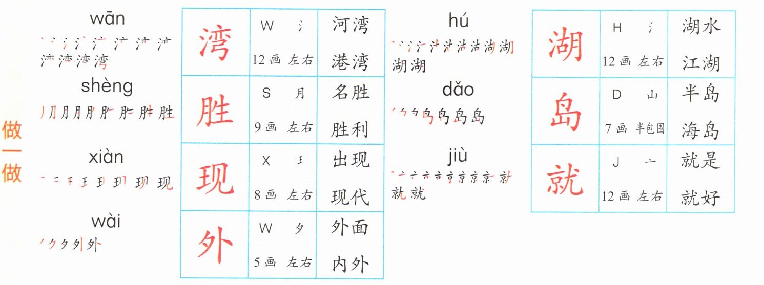 6. 岛:dǎo,部首:山,结构:半包围,笔画:7 画,组词:半岛、海岛。
