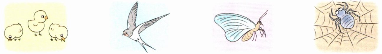 二 二 蝴蝶 蜘蛛 解析:此题考查仿写句子的能力。通过第一句可知,横线处需要填写的是数字或动物名。根据图片和语境,可知第二句两个空均应填写数字“二”,第三句应填写“蝴蝶”,第四句应填写“蜘蛛”。
