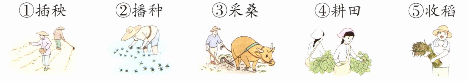 ①插秧 ②播种 ③采桑 ④耕田 ⑤收稻