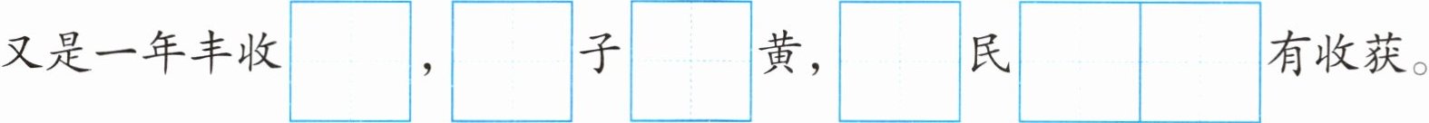 又是一年丰收$\overset{jì}{□}$,$\overset{gǔ}{□}子\overset{jīn}{□}$黄,$\overset{nóng}{□}民\overset{xīn}{}\overset{kǔ}{}□□$有收获。