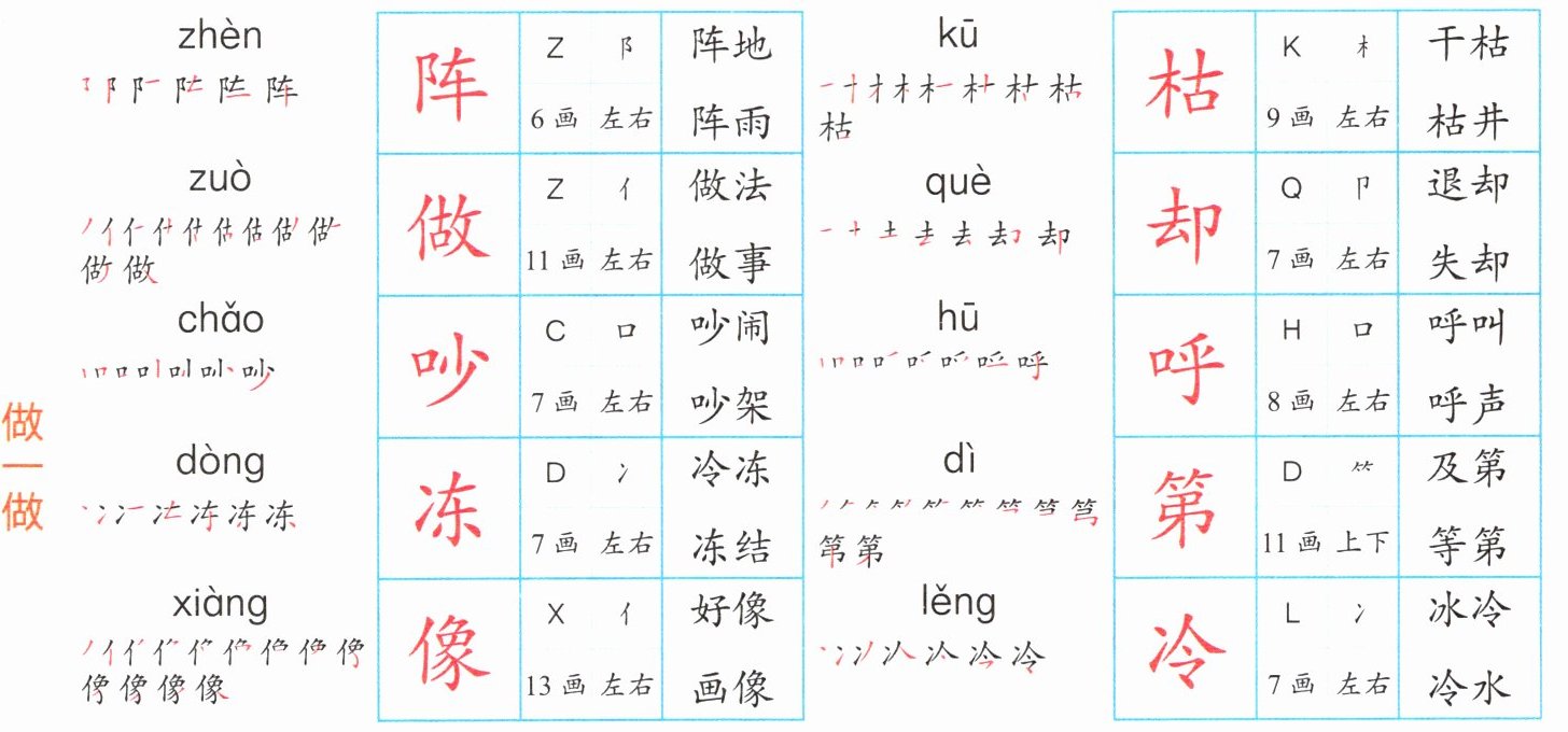 |zuò|做 Z 亻 做法 11画 左右 做事 却 Q 卩 退却 7画 左右 失却|