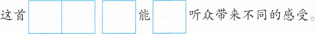 这首$\overset{\mathrm{m}\mathrm{í}\mathrm{n}\mathrm{g}\mathrm{q}\mathrm{ǔ}}{□ □ }$$\overset{\mathrm{z}\mathrm{ǒ}\mathrm{n}\mathrm{g}}{□ }能\overset{\mathrm{g}\mathrm{ě}\mathrm{i}}{□ }$听众带来不同的感受。