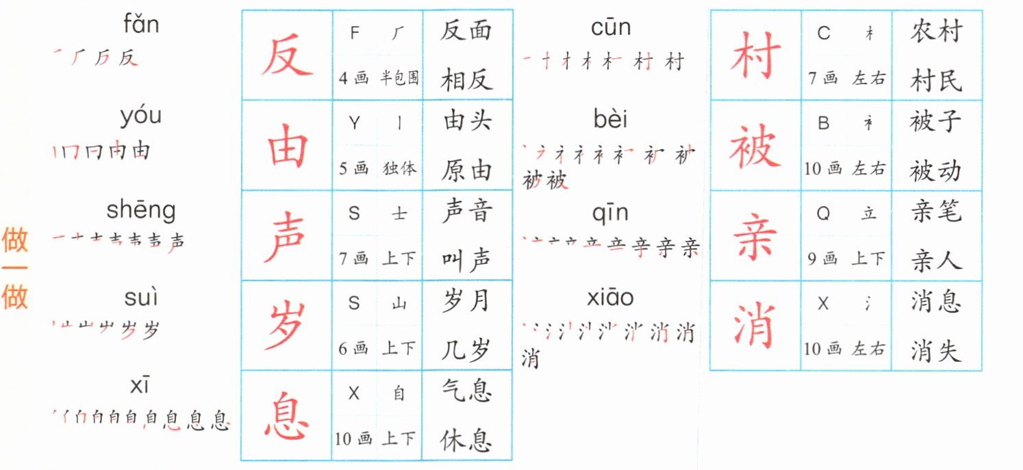 | 汉字 | 拼音 | 部首 | 笔画 | 结构 | 组词 |