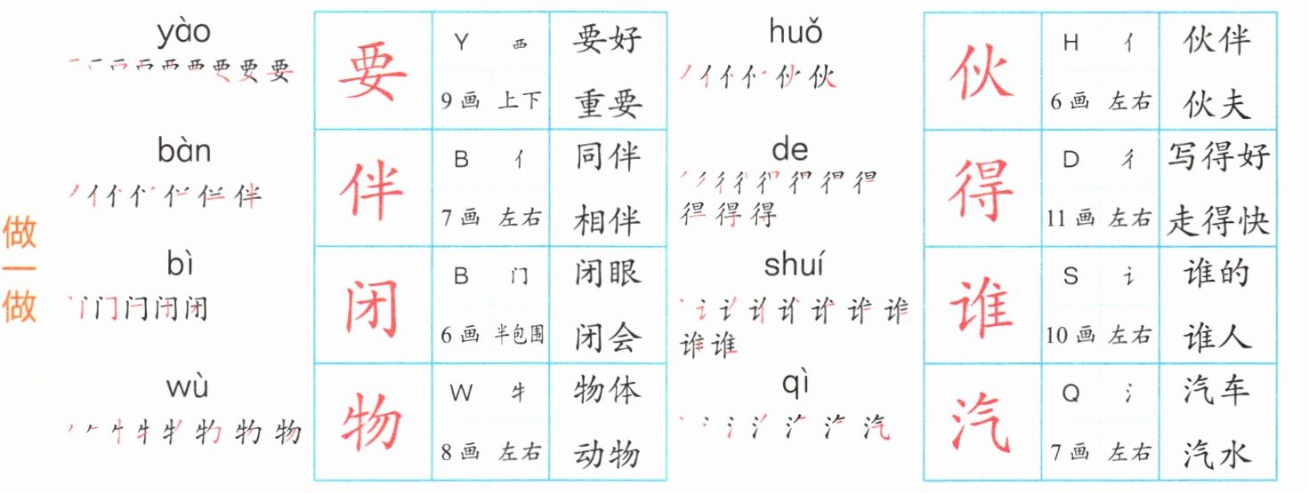 yào 要 Y 𠂇 要好 huǒ 伙 H 亻 伙伴
