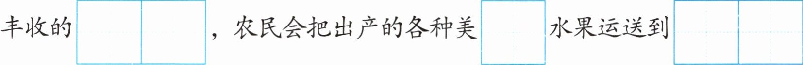 丰收的$\overset{\mathrm{y}\mathrm{u}è\mathrm{f}è\mathrm{n}}{□ □ }$,农民会把出产的各种美$\overset{\mathrm{w}è\mathrm{i}}{□ }水果运送到\overset{\mathrm{c}\mathrm{h}é\mathrm{n}\mathrm{g}\mathrm{s}\mathrm{h}ì}{□ □ }$。