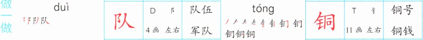 | 队 | D 阝 | 4 画 左右 | 队伍、军队 |