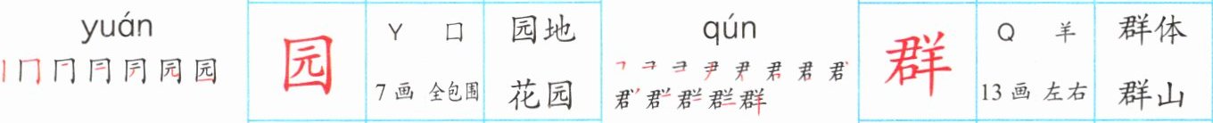 | 群 | Q 羊 | 13 画 左右 | 群体、群山 |
