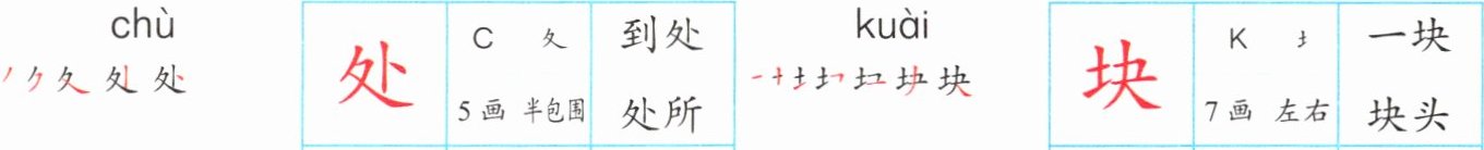 | 处 | C 夂 | 5 画 半包围 | 到处、处所 |