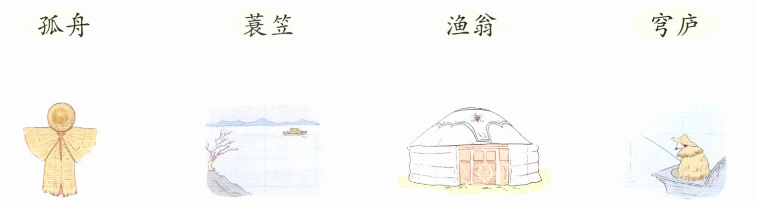 解析:此题考查诗人所处朝代及理解诗句的能力。《江雪》的作者是唐代诗人柳宗元。《江雪》前两句“千山鸟飞绝,万径人踪灭”的大意是,所有山中的飞鸟全都不见了,所有的路都不见人影踪迹,这两句诗为我们描绘了一幅寒冷而幽静的江乡雪景图。后两句“孤舟蓑笠翁,独钓寒江雪”的大意是,下着大雪的江面上只有一叶小舟,一位披着蓑衣戴着斗笠的渔翁独自坐在舟里垂钓,这两句诗为我们刻画了渔翁清高、孤傲的形象。