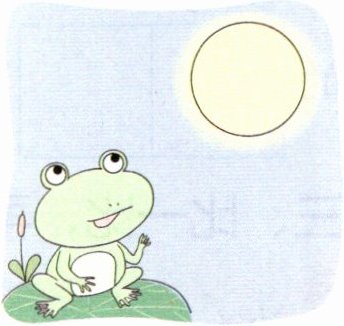 小青蛙抬头一瞧,果然,圆圆的月亮像个银盘(yín pán)一样好端端地挂在天上。他难为情地说:“我大概(gài)在做梦!”过了一会儿,他再次发现池塘里的月亮又被锯成了两半儿。