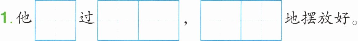 1. 他$\overset{\mathrm{l}\mathrm{ā}}{\mathrm{}}过\overset{\mathrm{y}\mathrm{ǐ}\mathrm{z}\mathrm{i}}{\mathrm{}}$,$\overset{\mathrm{z}\mathrm{ǐ}\mathrm{x}\mathrm{ì}}{\mathrm{}}$地摆放好。