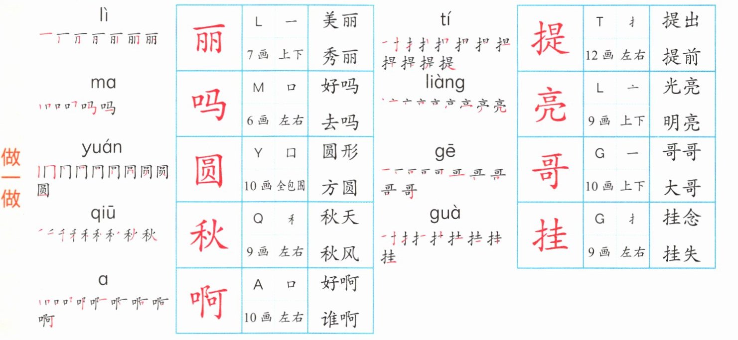 lì 丽;ma 吗;yuán 圆;qiū 秋;a 啊;tí 提;liàng 亮;gē 哥;guà 挂