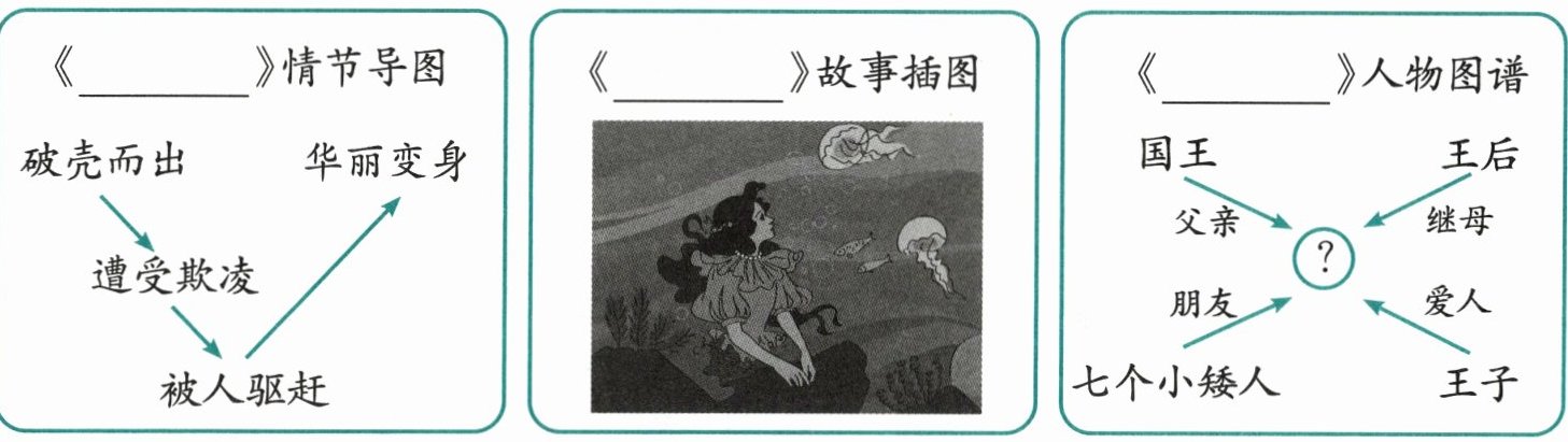 $\begin{array}{c} \boxed{\begin{array}{c} 《$______$》情节导图 \\ 破壳而出 \quad 华丽变身 \\ \downarrow \quad \downarrow \\ 遭受欺凌 \quad 被人驱赶 \end{array} } \\ \downarrow \\ \boxed{\begin{array}{c} 《$______$》故事插图 \\ \includegraphics[width= 0.2\textwidth]{story_illustration.jpg} \end{array} } \\ \downarrow \\ \boxed{\begin{array}{c} 《$______$》人物图谱 \\ 国王 \quad 王后 \\ \swarrow \quad \searrow \\ 父亲 \quad 继母 \\ \swarrow \quad \searrow \\ 朋友 \quad 爱人 \\ \swarrow \quad \searrow \\ 七个小矮人 \quad 王子 \end{array} } \end{array}$